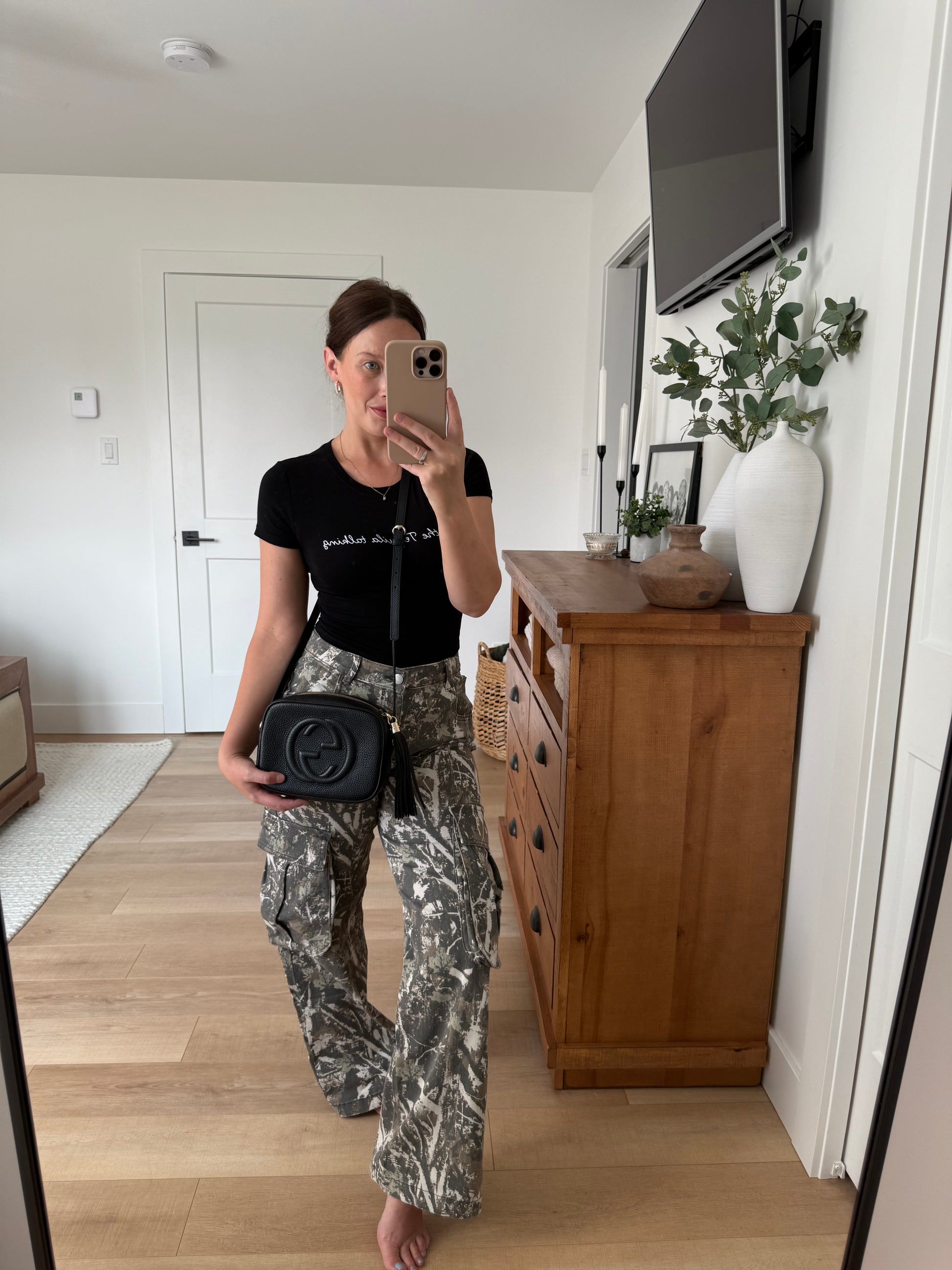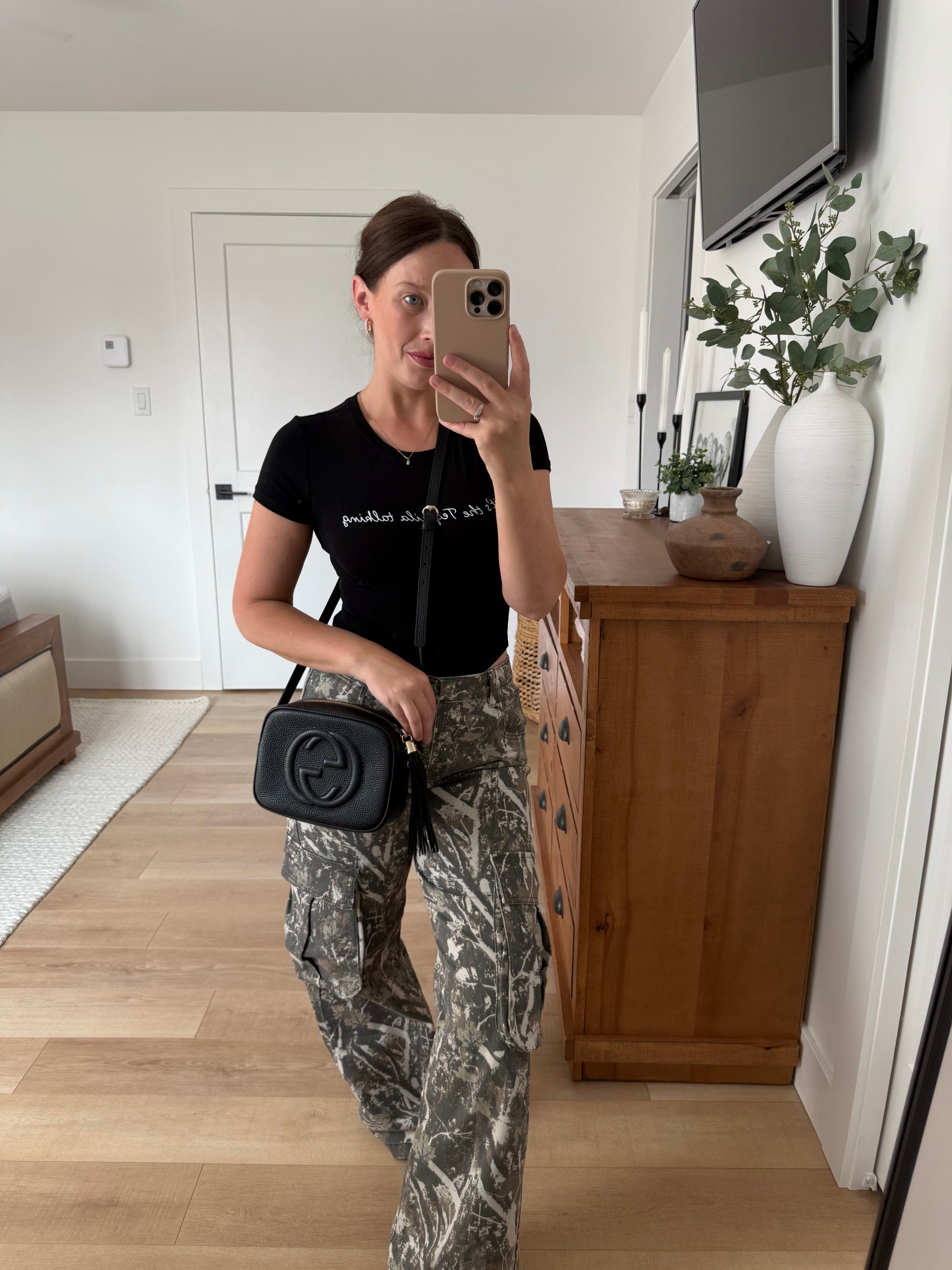 - Gold tone hardware