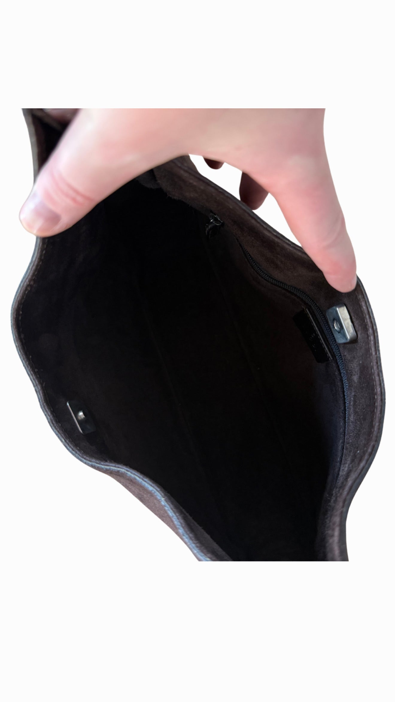 - Suede interior with zipper pocket